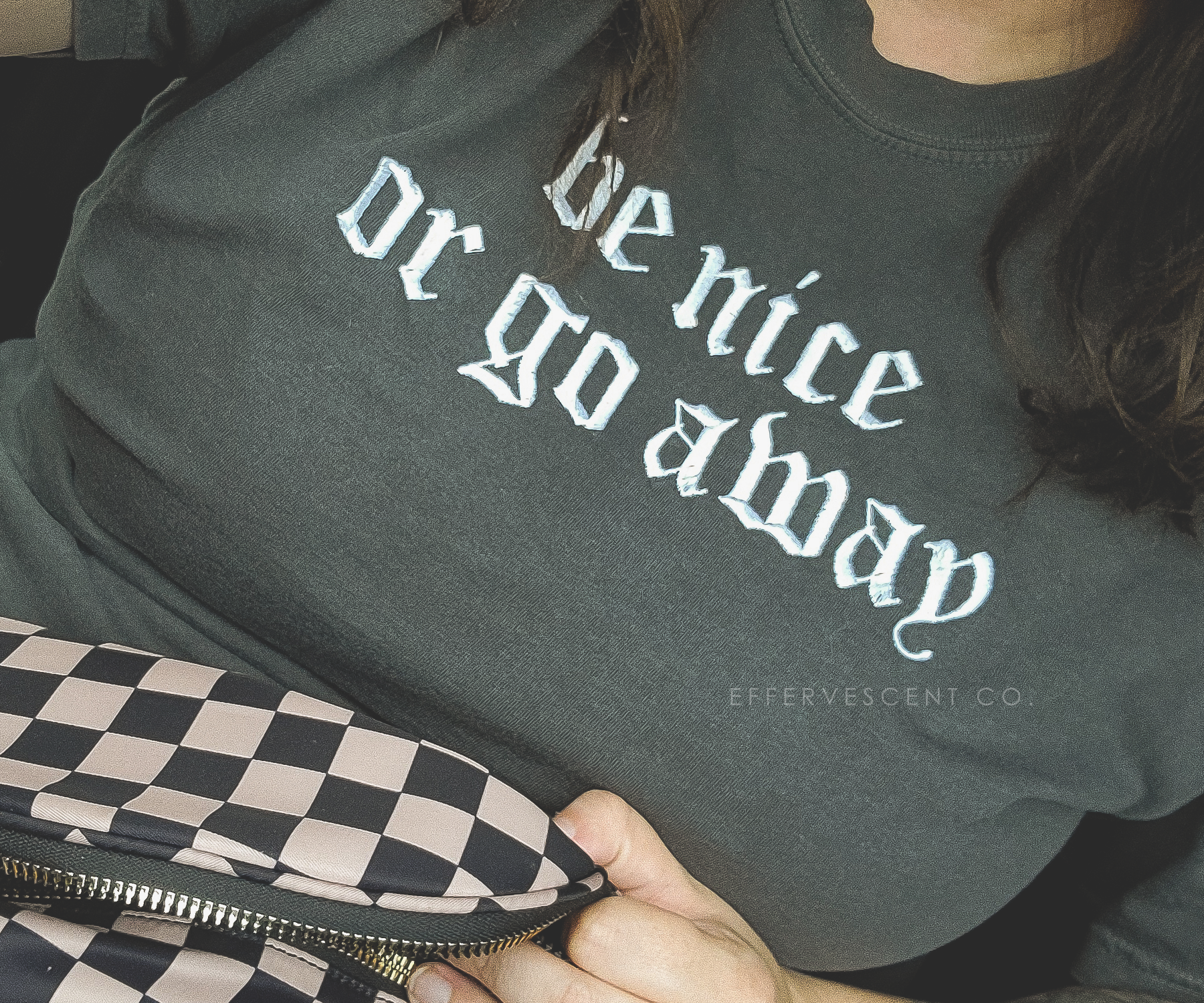 We like to make things EXTRA around here, so feel free to choose your own thread color. 😉 This step is not a requirement so if you leave it blank, no biggie, we will embroider in white on dark color, or black on lighter colors. Use the color charts attached for reference.