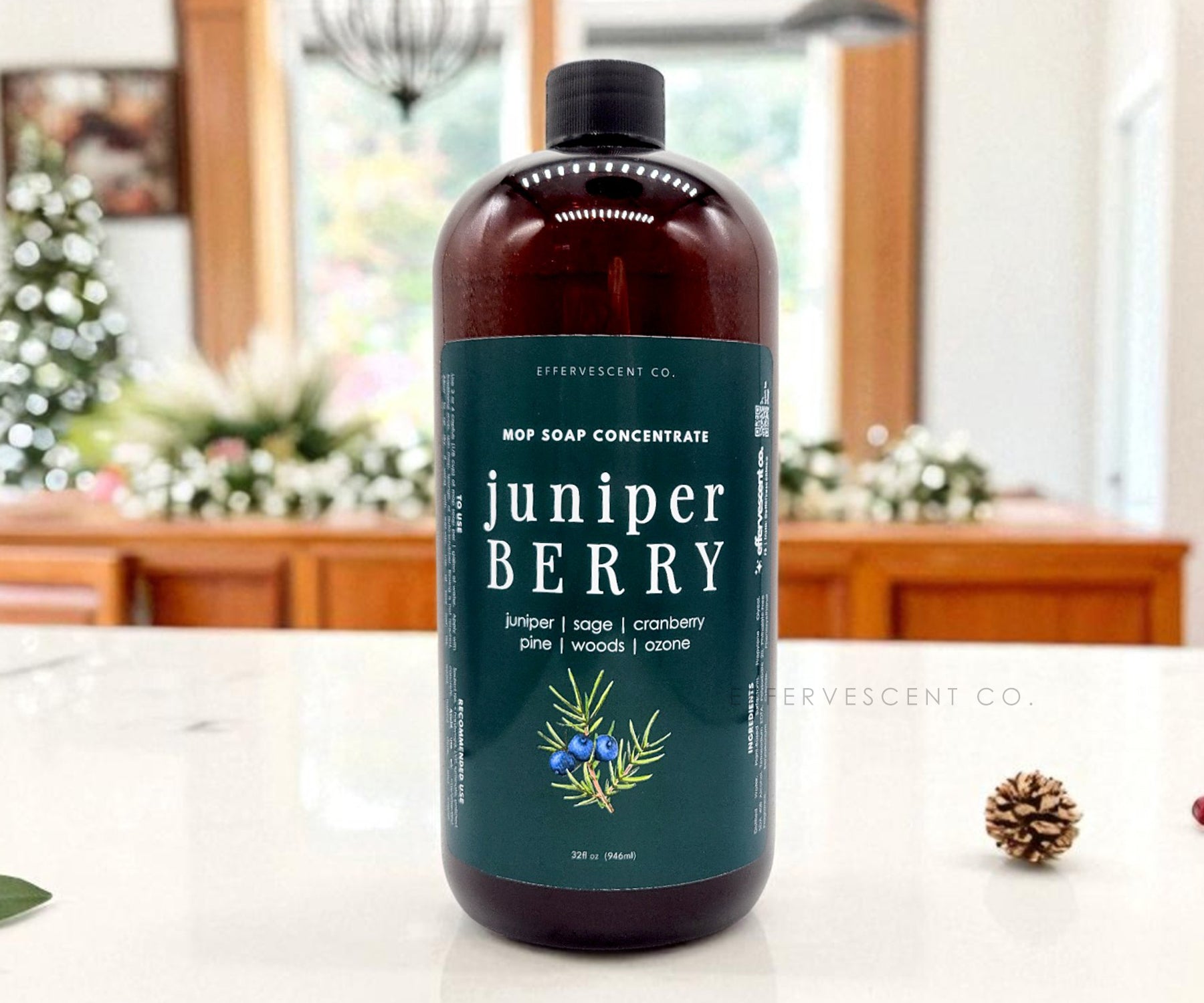 Juniper berries and cranberries, peppermint leaves layered over frosted pine.